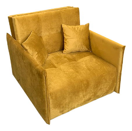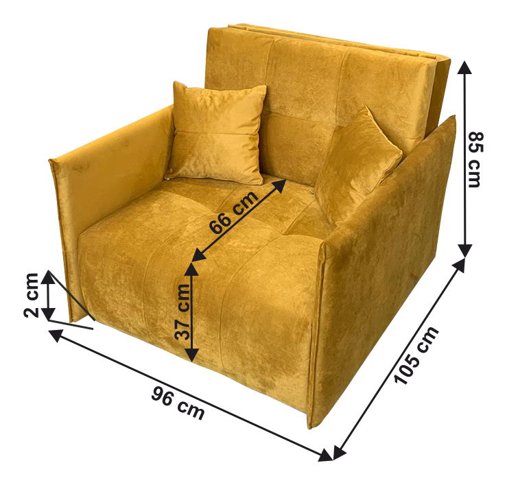 Kreslo Aricca (horčicová) je skvelým doplnkom pre vašu obývaciu izbu. S výškou 85 cm a hĺbkou 105 cm ponúka pohodlné a príjemné sedenie. Kreslo je vyrobené z kvalitnej látky Riviera 41 v horčicovej farbe, má výšku sedu 37 cm a hĺbku sedu 66 cm. Dizajn kresla zahŕňa aj výklopnú plochu s rozmermi 81x200 cm, ktorá poskytuje dostatok miesta pre pohodlný spánok. Nosnosť kresla je 90 kg. Výplň sedenia pozostáva z PUR peny a pružín Falista. Okrem toho kreslo ponúka aj úložný priestor a 2 dekoratívne vankúše. Kreslo Aricca s dekoratívnym šitím a jemnými líniami je dokonalým kúskom nábytku pre váš domov.