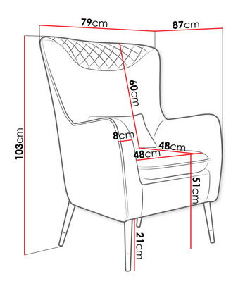 rám: 16 mm drevovláknitá doska + 22 mm borovicové drevo, sedadlo: T30 pena + gumený pás, operadlo: T30 pena + HDF doska, kovové nohy, čalúnené operadlo pevne fixované, vankúš v cene, kreslo je voľne stojace (chrbát je potiahnutý látkou)