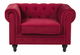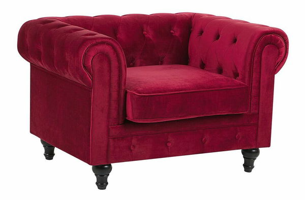Toto kreslo sa vyznačuje veľkou siluetou so širokými zaoblenými opierkami v ikonickom štýle Chesterfield, ktorý sa hodí do každého moderného alebo tradične zariadeného interiéru. Nízke operadlo a mäkké, husto vyplnené sedadlo poskytujú vynikajúci komfort počas sedenia. Kreslo je čalúnené nádhernou zamatovou látkou v sýtom odtieni červenej a je doplnené kosoštvorcovým prešívaním s gombíkmi. Táto anglická klasika sa ľahko udržiava a bude vyzerať skvele v akomkoľvek interiéri.