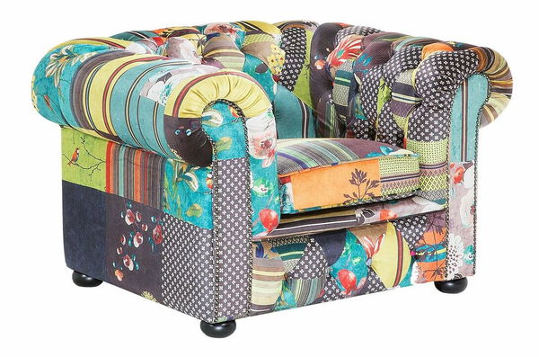 Klasické kreslo v štýle Chesterfield s úplne novým, moderným patchworkovým dizajnom sa stane očarujúcim doplnkom vašej obývacej izby. Nadčasový dizajn kresla tvorí čalúnené sedadlo s prešívaným operadlom a zaoblené bočné opierky. Hrubá penová výplň zaručuje pohodlné sedenie a vďaka snímateľným poťahom na vankúšoch je čistenie prípadných škvŕn jednoduchšie. Toto kreslo je kombináciou dvoch rôznych štýlov a najlepšie vynikne ako dizajnový kus nábytku v interiéroch zariadených v eklektickom a boho štýle.