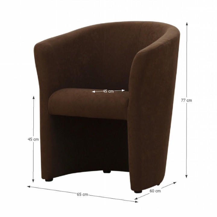 Kreslo Cubali (mikro hnedé) s výškou 77 cm a hĺbkou 60 cm je moderný kus nábytku ideálny pre kaviarne, kancelárie alebo obývacie izby. Je čalúnené mikrofázou v hnedom odtieni. Je možné objednať kreslo v 5 farebných prevedeniach látky Mikrofáza, 6 farebných príplatkových prevedeniach ekokože alebo 3 farebných prevedeniach látky šenil Lava. Dodacia doba pre individuálne farebné prevedenie je 6-8 týždňov. Materiál je mikrofáza s odolnosťou textílie podľa testu Martindale: 85 000 oderov. Rozmery sú 65x60x77 cm a nosnosť je 120 kg. V galérii nájdete vzorkovník a farebnú kombináciu uvediete pri objednávke alebo nás kontaktujete mailom alebo telefonicky.