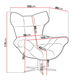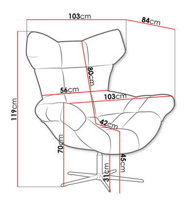 rám: forma zo sklenených vlákien, kovový základ, sedadlo: polyuretánová pena N30, chrbát: polyuretánová pena T21, geometrické prešívanie, funkcia hojdania a otáčania o 360 stupňov, maximálne zaťaženie: do 120 kg