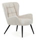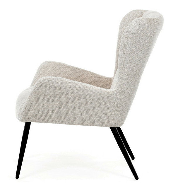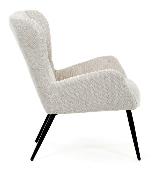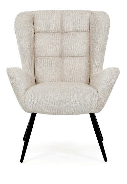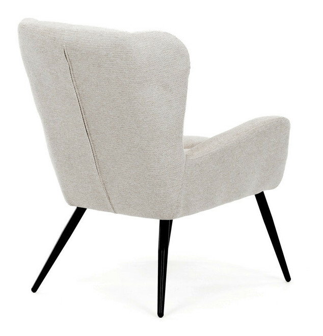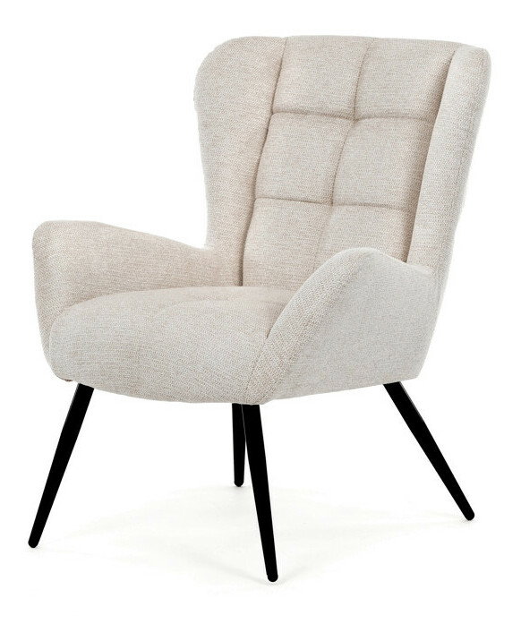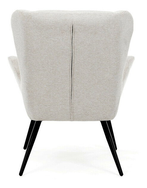 Kreslo ušiak v krémovom odtieni ponúka pohodlie vďaka vysokému polstrovaniu sedáka aj operadla, ktoré je potiahnuté prémiovou látkou s príjemnou textúrou. Pevné čierne kovové nohy zabezpečujú stabilitu a dlhú životnosť, zatiaľ čo integrované podrúčky prispievajú k ergonomickému posedeniu. Dizajn s charakteristickými vysokými bočnými opierkami poskytuje oporu hlavy a ramenám, čo zvyšuje komfort pri oddychu. Kreslo je vhodné do moderných aj klasických interiérov, kde vynikne svojím nadčasovým tvarom a neutrálne farebným prevedením.