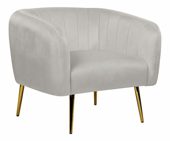 Stavte na luxus, pohodlie a eleganciu a spravte na svojich hostí dojem. Zamatové čalúnenie v jemnom odtieni svetlosivej upúta pohľady najmä svojím očarujúcim vzhľadom a hladkou textúrou. Kombinácia moderného tvaru a elegantných kovových nôh v zlatom farebnom prevedení pôsobí veľmi honosne a príjemne. Z tohto kresla sa stane vaše obľúbené miesto, kde si budete môcť pohodlne čítať, rozprávať sa alebo relaxovať.