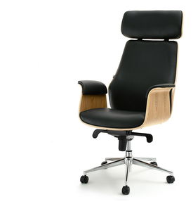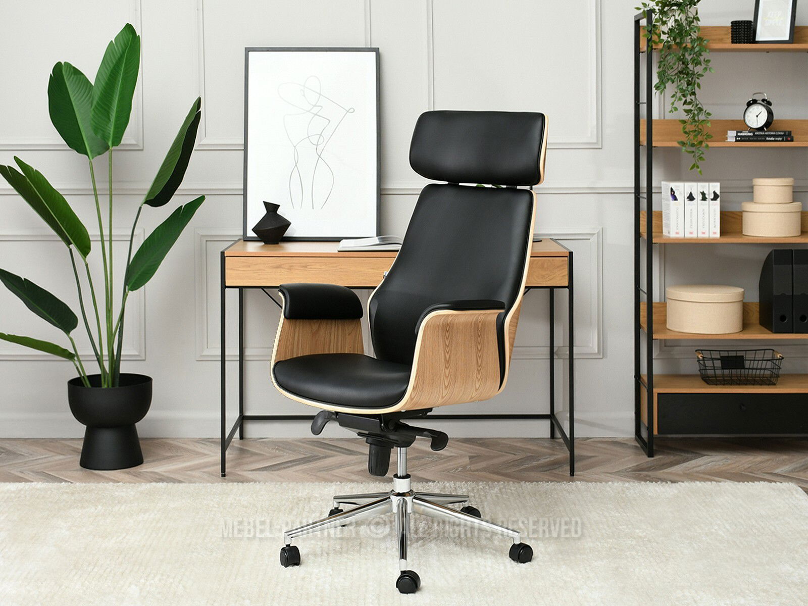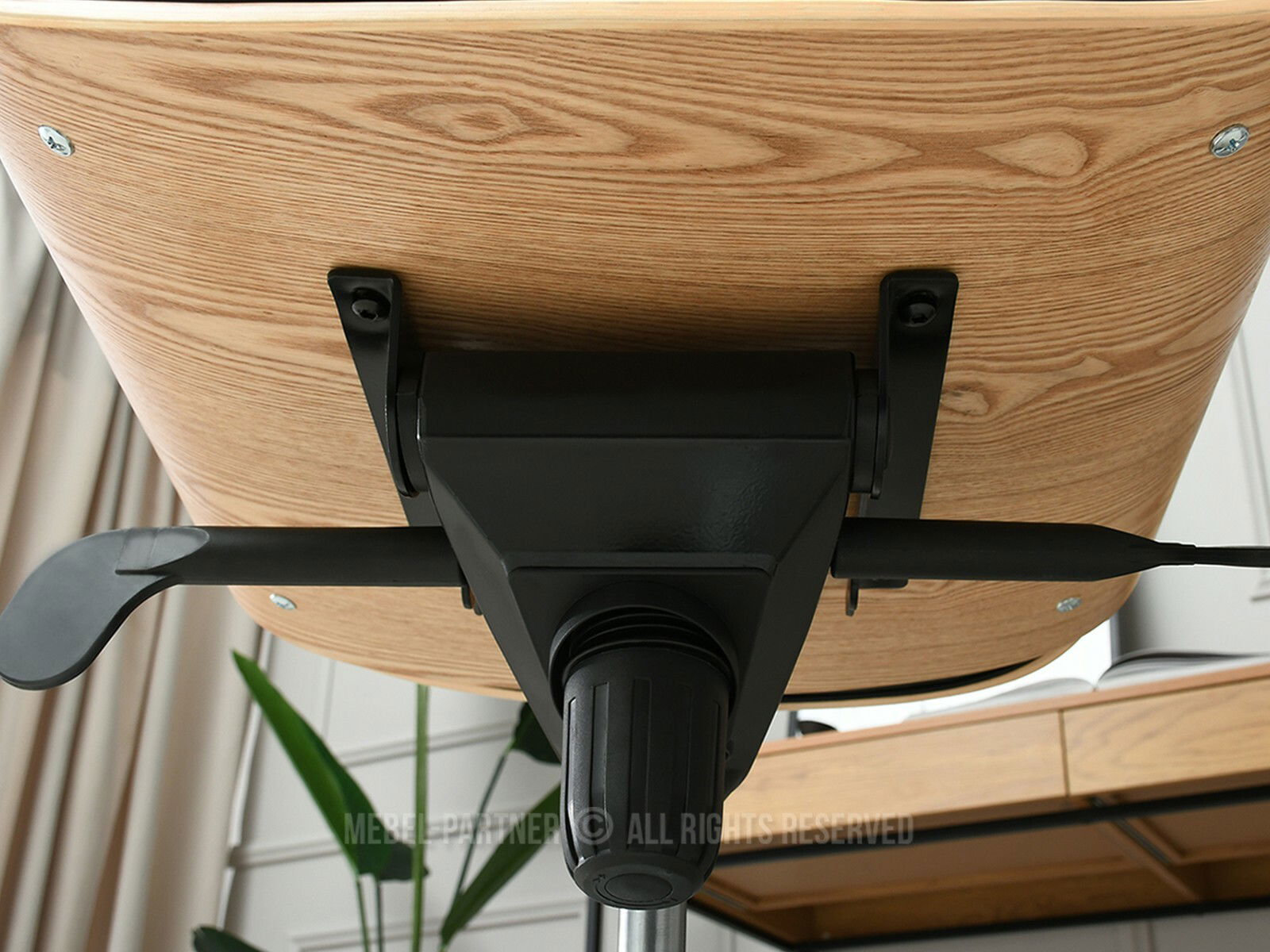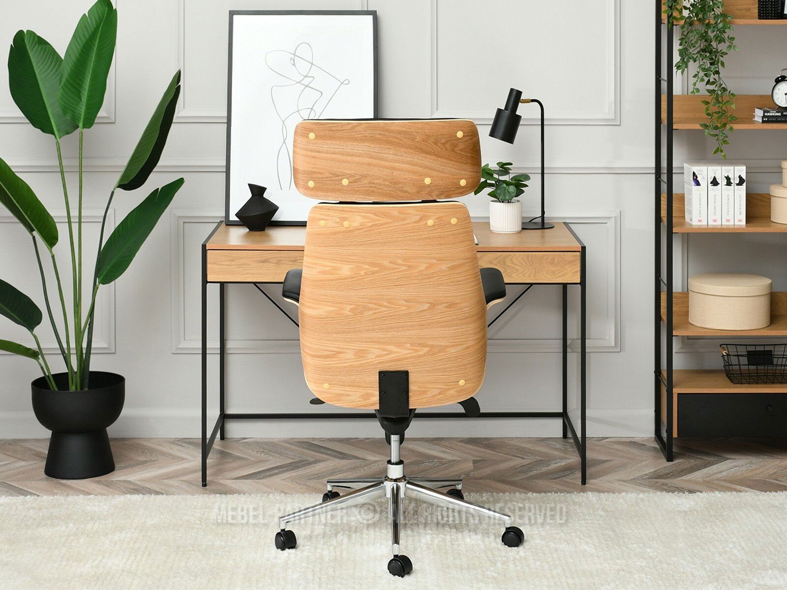 - Prírodný dubový povrch kontrastuje s hladkou čiernou koženkou, čo dodáva kreslu nadčasový vzhľad.