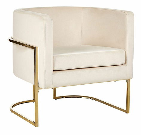 Ponorte sa do pohodlia, ktoré ponúka toto elegantné dizajnové kreslo. Mäkká výplň a hladké zamatové čalúnenie vám poskytnú pohodlné sedenie a navodia atmosféru, akú možno zažiť v luxusných hoteloch. Vďaka kovovému rámu v zlatej farbe sa hodí do interiérov v štýle glamour, ale aj do tých moderne zariadených. Umiestnite ho do obývacej izby a zlaďte s konferenčným stolíkom s lesklými nohami alebo do spálne, kde vynikne v kombinácii s toaletným stolíkom.