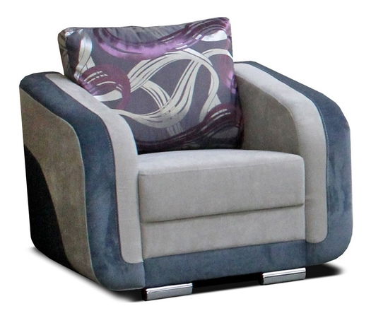 Kreslo Vento s veľkým vankúšom (slúži ako opierka). Farebná kombinácia je šedá (Ibiza 15 svetlo sivá) + fialová (Ibiza 16 tmavo sivá), fialové vankúše sú vo vzore Emma 310.