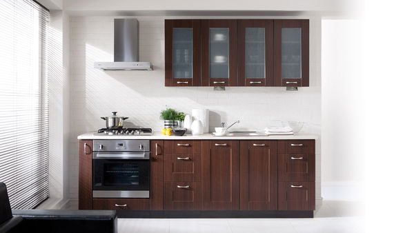 Kuchyňa vhodná do moderne zariadeného bytu. Tmavá farba višne malaga je doplnená o pekné strieborné úchyty.