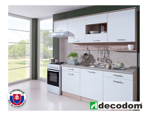 Uvedená cena je bez, drezu, spotrebičov, doplnkov a závesných políc. Pracovná doska sa dodáva vcelku bez vyrezanej diery na drez.