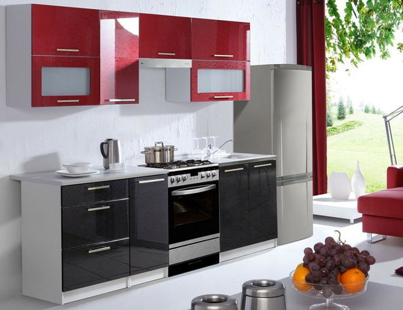 Luxusná kuchyňa vhodná predovšetkým do panelákových bytov. Táto kuchyňa je navrhnutá tak, že skrinky sa dajú poskladať v ľubovoľnom poradí. To vám umožní si zostaviť kuchyňu podľa svojich predstáv. Pracovná doska je delená podľa veľkosti spodných dvierok (okrem skrinky na drez). Sokel aj korpus sú vo farbe šedý popol. Spodné dvierka sú vo farbe čiernej v lesku, horné v červenom lesku a sú k dispozícii aj v bielom alebo zlatom lesku. Lesky majú v sebe atraktívny vzor. Úchyty sú kovové zlatej farby. Vrchné skrinky sú výklopné pomocou plynových piestov.