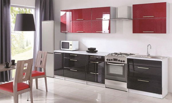 Luxusná kuchyňa vhodná predovšetkým do panelákových bytov. Táto kuchyňa je navrhnutá tak, že skrinky sa dajú poskladať v ľubovoľnom poradí. To vám umožní si zostaviť kuchyňu podľa svojich predstáv. Pracovná doska je delená podľa veľkosti spodných dvierok (okrem skrinky na drez). Sokel aj korpus sú vo farbe šedý popol. Spodné dvierka sú vo farbe čiernej v lesku, horné v červenom lesku. Lesky majú v sebe atraktívny vzor. Úchyty sú kovové zlatej farby. Vrchné skrinky sú výklopné pomocou plynových piestov.