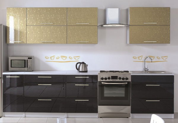 Luxusná kuchyňa vhodná predovšetkým do panelákových bytov. Táto kuchyňa je navrhnutá tak, že skrinky sa dajú poskladať v ľubovoľnom poradí. To vám umožní si zostaviť kuchyňu podľa svojich predstáv. Pracovná doska je delená podľa veľkosti spodných dvierok (okrem skrinky na drez). Sokel aj korpus sú vo farbe šedý popol. Spodné dvierka sú vo farbe čiernej v lesku, horné v zlatom lesku. Lesky majú v sebe atraktívny vzor. Úchyty sú kovové zlatej farby. Vrchné skrinky sú výklopné pomocou plynových piestov.
