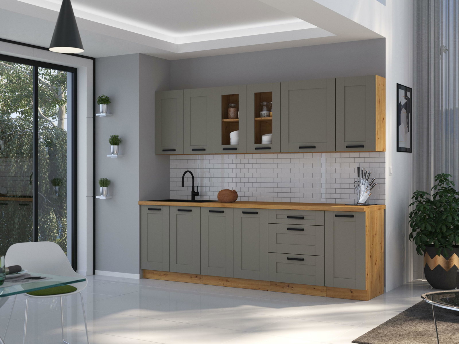 Kuchyňa Lucid 19 Claygrey / Dub Artisan predstavuje štýlovú zostavu, ktorá zaujme moderným vzhľadom a praktickým prevedením. Kombinácia matných sivých dvierok v odtieni Claygrey a teplého dekoru dreva Dub Artisan vytvára elegantný kontrast, ktorý vnesie do priestoru harmóniu a nadčasový charakter. Zostava je vyrobená z kvalitnej MDF a laminovanej drevotriesky, čo zaručuje jej dlhú životnosť. Vďaka systému tichého zatvárania a kovovým úchytkám je každodenné používanie pohodlné a tiché. Dvierka je možné osadiť univerzálne, na pravú alebo ľavú stranu, čo uľahčuje prispôsobenie kuchyne konkrétnemu priestoru.