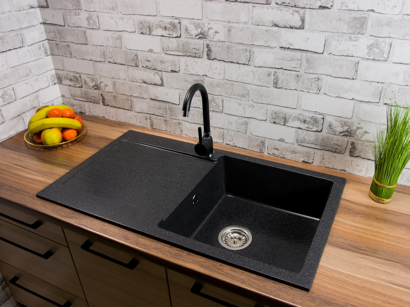 Jednokomorový kuchynský drez Adaxa (čierna + textúra) (s 2 otvormi pre batériu) (L) s odkvapkávačom je ideálnou voľbou pre tých, ktorí preferujú trvanlivosť a ľahkú údržbu. Vyrobený z granitu, tento drez je mimoriadne odolný voči mechanickému poškodeniu, teplotným rozdielom a poškriabaniu. Jeho povrch je protiplesňový a ľahko sa čistí, zároveň odoláva škvrnám a zachováva svoju farbu. S týmto drezom je práca v kuchyni pohodlná a bezstarostná.