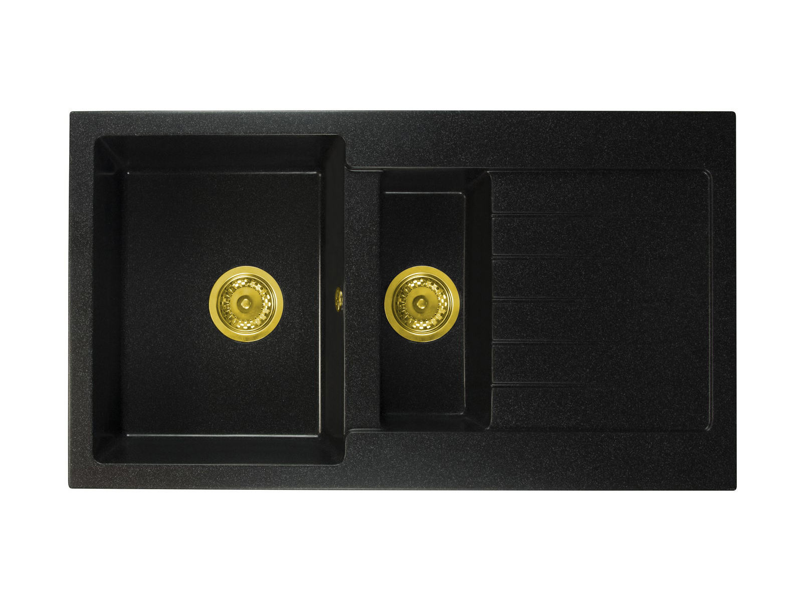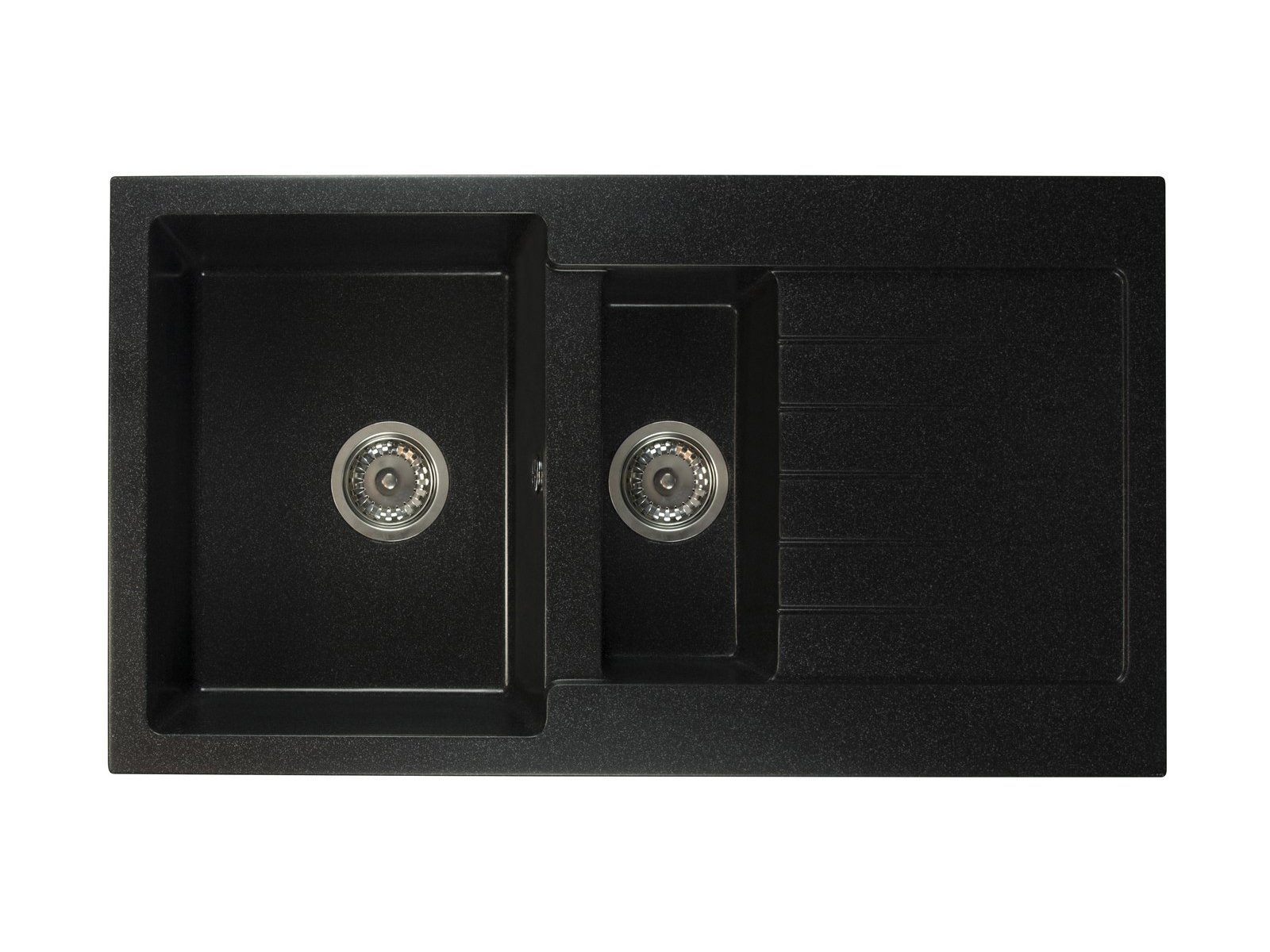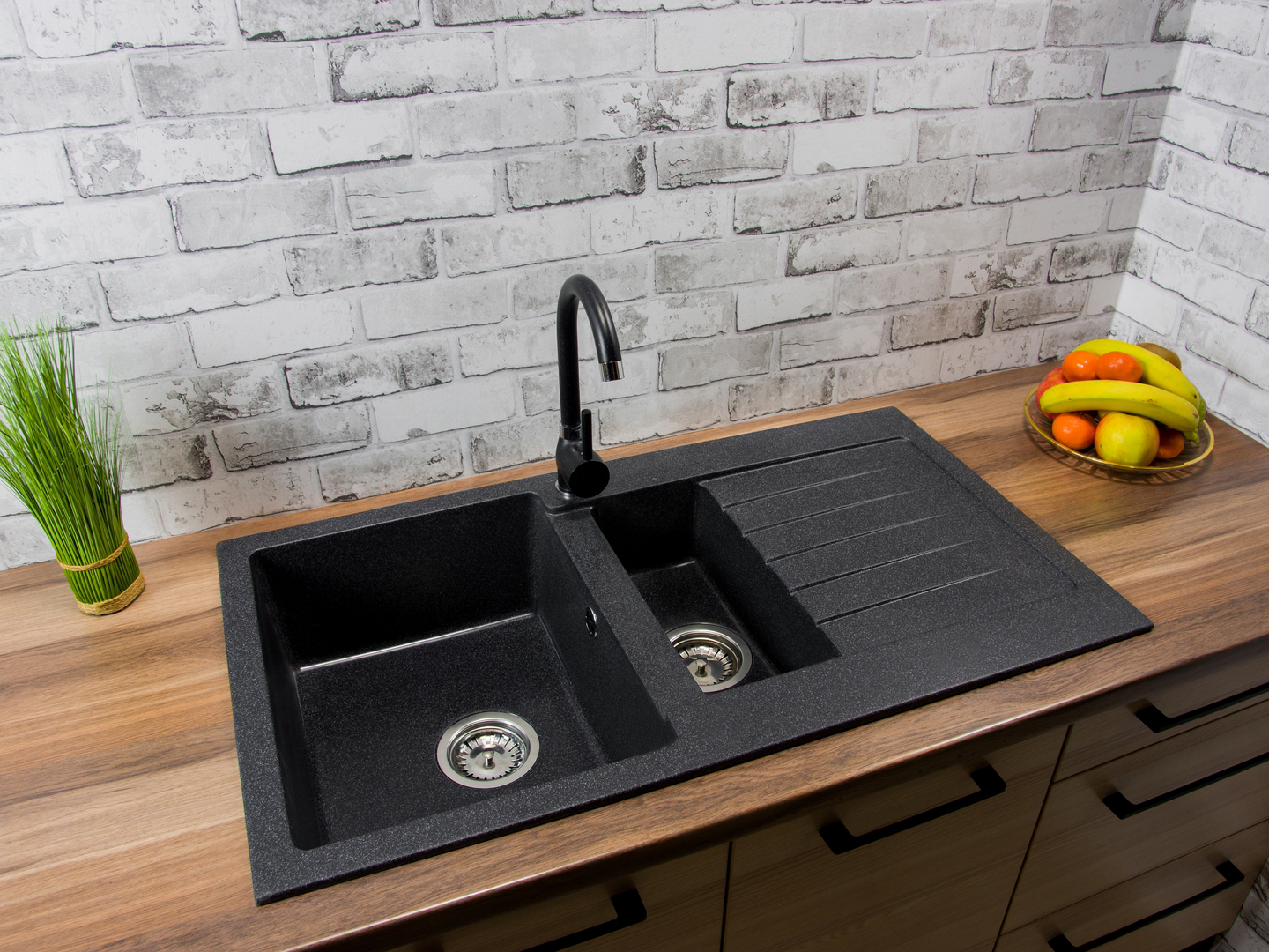 Kuchynský drez Altava (čierna + textúra) (s 2 otvormi pre batériu) (P) - Jedenapolkomorový drez Altava je výnimočný kuchynský drez vyrobený z granitu a vyznačujúci sa odolnosťou voči mnohým faktorom. Vďaka použitiu špeciálnej zmesi granitu a granitového spojiva je drez odolný voči tepelným šokom, nárazom a poškriabaniu. Vysoká mechanická odolnosť je zárukou, že drez zostane dlho neporušený, bez viditeľných známok používania. Povrch drezu je protiplesňový, čo zaručuje vysokú úroveň hygieny vo vašej kuchyni. Je odolný voči škvrnám, zmene farby a jeho povrch sa ľahko čistí.