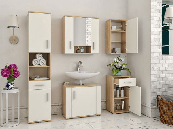 Kúpeľňa Leah 2 v vás očarí svojou harmóniou a praktickosťou. V kombinácii biela matná a dub sonoma prináša do priestoru svieži a prirodzený vzhľad. Premyslene navrhnuté úložné jednotky, vrátane vysokej skrinky, skrinky pod umývadlo a zrkadlovej skrinky, ponúkajú dostatok priestoru na usporiadanie uterákov, kozmetiky a ďalších potrieb. Jemné drevené tóny v kontraste s bielym povrchom vytvárajú harmonické prostredie, ktoré zjednocuje praktickosť a estetickú hodnotu. Tento set je ideálnou voľbou pre moderné kúpeľne, ktoré spájajú funkčný dizajn s vizuálnou eleganciou, no vytvára miesto plné pohody a vkusu.
