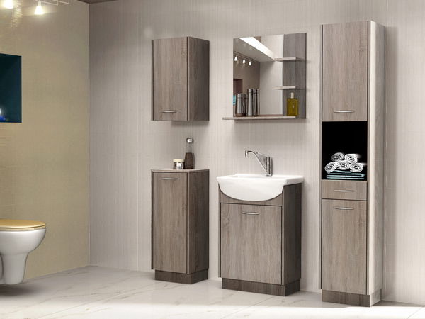 Kúpeľnová zostava s množstvom odkladacieho priestoru. Už nebudete mať predmety len tak voľne sa povaľujúce kade tade. Pekne si ich zorganizujete a každý bude mať svoje miesto. Vysoká skrinka je vybavená je 2 dvierkami, jednou otvorenou poličkou uprostred, pod ktorou je umiestnená plytká zásuvka. Kúpeľňová skrinka pod umývadlo má jedny dvierka a priestor na umiestnenie umývadla. Dve skrinky vpravo majú každá jedny dvierka. Panel so zrkadlom má jednu podlhovastú poličku a dve krátke.