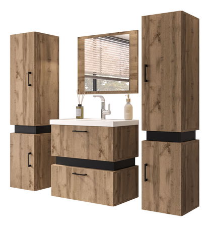 Kúpeľňa typ 02 Trina v dub wotan farbe je ideálnym miestom pre relaxáciu a starostlivosť o telo. Kúpeľňová zostava obsahuje 2 skrinky 135, 1 skrinku pod umývadlo a 1 dosku so zrkadlom. Korpus zostavy je vyrobený z laminovanej dosky s hrúbkou 16 mm a zakončený PVC dyhou pre lepšiu odolnosť voči poškodeniu. Všetky hrany sú dyhované a chránené proti vlhkosti. Skrinka pod umývadlo má otvorenú zadnú časť. Úchytky sú čiernej farby. Rozmery zostavy sú 135x30x31,6 cm pre 2 skrinky, 90x30x31,6 cm pre 1 skrinku a 57x60x34,6 cm pre skrinku pod umývadlo. Panel so zrkadlom má rozmery 50x60 cm. Dvierka majú univerzálne otváranie L/P a zákazník si môže zvoliť smer otvárania pri montáži. Nábytok sa pripevňuje na stenu pomocou hmoždiniek. Umývadlo nie je súčasťou balenia, ale je možné ho zakúpiť na našej webovej stránke. Balík č. 1 má rozmery 130x38x93 cm a váži 20 kg, balík č. 2 má rozmery 130x38x93 cm a váži 20 kg, balík č. 3 má rozmery 10x39,5x67 cm a váži 14 kg a balík č. 4 má rozmery 4,5x57x67 cm a váži 6,5 kg.