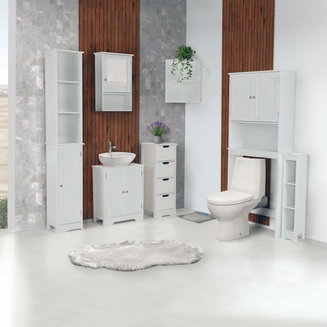 - Vysoká kúpeľňová skrinka – hlavný úložný priestor. Jej šírka môže byť od 30 po 60 centimetrov a napomáha aj uloženiu do výšky, ktoré šetrí miesto.