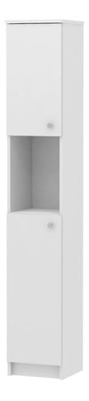 Vysoká kúpeľňová skriňa s množstvom úložného priestoru je uzavretá dvierkami. V strednej časti je rozdelená otvoreným úložným priestorom s poličkou.