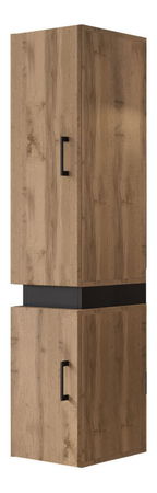 Kúpeľňová skrinka Trina v dub wotan farbe má výšku 135 cm a hĺbku 31,6 cm. Táto skrinka je veľmi variabilná pri montáži, kde si môžete zvoliť otvorený aj uzavretý priestor podľa potreby. Počet poličiek a dvierok je presne určený, no môžete si ich umiestniť tam, kde chcete. Táto kúpeľňová skrinka je súčasťou niekoľkých variantov kompletných kúpeľňových zostáv, ktoré ponúkame. Korpus skrinky je vyrobený z laminovanej dosky (16 mm) a hrany sú zakončené PVC dyhou odolnou voči každodennému poškodeniu. Zadná časť skrinky je vyrobená z HDF dosky a úchytky sú v čiernej farbe. Dvierka sa dajú otvárať zľava aj zprava, čo je univerzálna varianta. Pri montáži sa skrinka pripevňuje na stenu pomocou hmoždiniek. Rozmery balíka sú 130x38x93cm/20 kg.