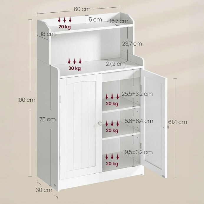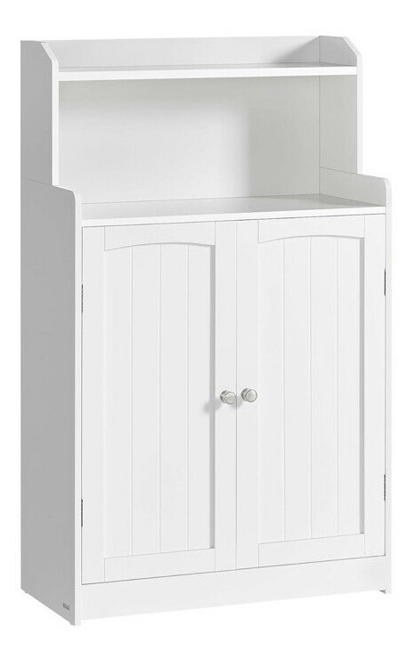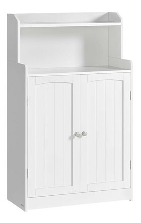 Kúpeľňová skrinka s rozmermi 60x30x100 cm je vyrobená z MDF dosiek s matnou bielou povrchovou úpravou, ktorá verne napodobňuje prírodný drevený dekor a ľahko sa udržiava. Skrinka ponúka praktický úložný priestor za dvierkami s decentnými kovovými úchytkami a otvorenú poličku navrchu pre jednoduchý prístup k často používaným predmetom. Stabilné prevedenie z MDF zabezpečuje pevnosť a dlhú životnosť nábytku, ktorý je vhodný najmä do kúpeľní a ďalších vlhkých priestorov vďaka odolnosti povrchu. Dizajn s mierne zaoblenými hranami a jednoduchými líniami prispieva k čistému a sviežemu vzhľadu interiéru.