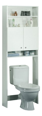 Vysoká skrinka nad záchod so skrinkovou časťou s poličkou a otvorenou regálovou časťou.