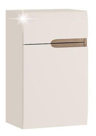 Jednodverová dolná skrinka s jednou hornou zásuvkou vyrobená v ľavom prevedení a vyrobená z odolného materiálu laminovanej DTD, predné časti sú vyrobené z MDF bielej farby - extra vysoký lesk, s elegantnými doplnkami v hnedej farbe TRUFLA - dizajnovým pásom zasahujúcim do 3/4 šírky skrinky presahujúcim do pravého boku skrinky. Korpus je bielej farby, skrinka je odolná voči poškriabaniu, vlhkosti, vysokej teplote. Dvierka majú moderne zaoblené hrany