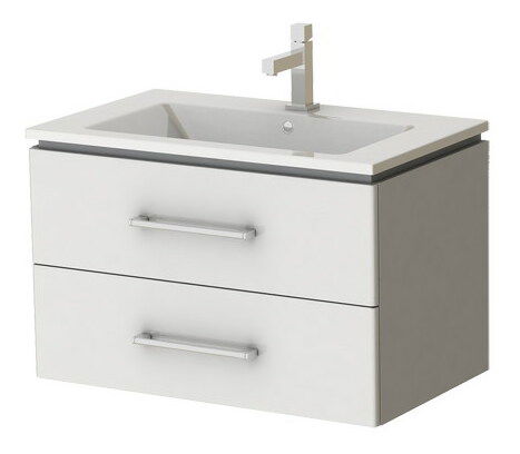 Závesná skrinka na stenu s umývadlom. Skrinka má dve zásuvky s podlhovastým kovovým úchytom. Praktická najmä pre kozmetiku, uteráky, fén, či kulmu na vlasy.