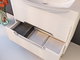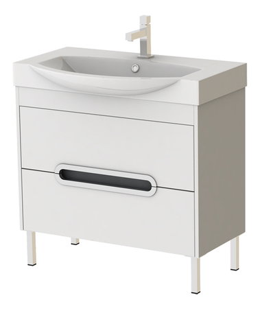 Kúpeľňová skrinka s umývadlom s dvomi zásuvkami v krásnom čistom modernom dizajne. Skrinka má dve užitočné zásuvky, do ktorých si uložíte uteráky, kozmetické potreby a iné doplnky, ktoré v kúpeľni využijete. Skrinka stojí na kovových nožičkách.