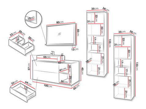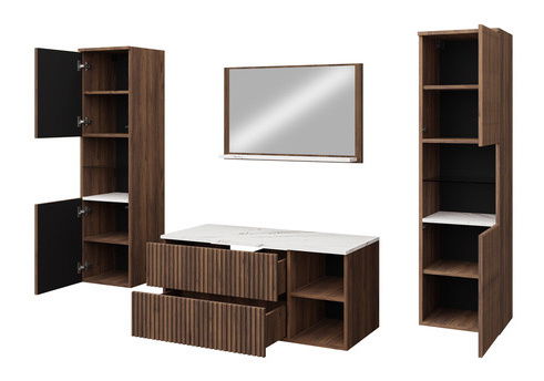 ZobraziťKúpeľňová zostava je ideálnou voľbou pre tých, ktorí hľadajú pohodlie a štýl. Pozvite drážky do vašej kúpeľne! Zostava Kiegi Ryfel III zvýrazní elegantný a predovšetkým prívetivý vzhľad interiéru. Symetrické drážky, ktoré zdobia čelá, dodajú charakteristický vzhľad celej miestnosti. Dodávajú nádych modernosti a predovšetkým zatraktívňujú celý aranžmán. Medzi výhody veľkej zostavy kúpeľňového nábytku Kiegi Ryfel III patrí: funkčnosť. Súprava je navrhnutá tak, aby poskytovala čo najviac úložného priestoru a ponúka množstvo priehradiek. Do závesných skriniek usporiadate väčšiu kozmetiku, pracie prášky a tekutiny, dostatok miesta je aj na uteráky a chémiu v domácnosti. Nechajte zasa skrinku pod umývadlo, aby sa stala praktickým miestom pre často používané doplnky. Rozmery: Zrkadlo Kiegi Ryfel: šírka: 80 cm, výška: 50 cm, hĺbka: 12 cm, Skrinka pod umývadlo Kiegi Ryfel: šírka: 100 cm, výška: 45 cm, hĺbka: 45 cm, Závesná skrinka Kiegi Ryfel 2x: šírka: 35 cm, výška: 133 cm, hĺbka: 34 cm, Umývadlo 550x420x115 (ako doplnková možnosť za príplatok): šírka: 55 cm, výška: 12 cm, hĺbka: 42 cm Prevedenie: korpus: laminovaná drevotrieska hrúbky 16 mm, fronty: drážkovaná MDF doska, hrúbka 18 mm, ABS hrana hrubá 0,5 mm, chrbát vyrobený z HDF dosky, polica - 4 mm hrubé tvrdené sklo (stĺpik), závesná skrinka je univerzálna - pri montáži si zákazník zvolí, ako sa bude čelo otvárať (vľavo/vpravo), spodné montážne vodidlá, pánty s tichým zatváraním, žiadne rukoväte, otvárací systém "PUSH TO OPEN", umývadlo za príplatok, sifón za príplatok, umývadlové batérie viditeľné na fotografii nie sú zahrnuté v cene, prvky mramorovej farby sú vyrobené z laminovanej drevotrieskovej dosky s hrúbkou 16 mm Záruka: 24 mesiacov