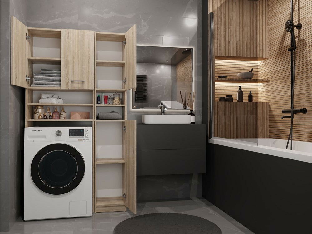 Kúpeľňová zostava Molinos 1 v elegantnej farbe dub sonoma je ideálnym riešením pre každú modernú kúpeľňu, kde je potrebné efektívne využiť priestor. S praktickým regálom a skriňou nad práčku ponúka dostatok úložného priestoru na všetky potrebné veci, pričom zachováva minimalistický a elegantný dizajn. Vyrobená z kvalitnej laminovanej drevotriesky s ABS hranami, táto zostava je odolná voči mechanickému a chemickému poškodeniu. S možnosťou voľby strany otvárania dverí sa prispôsobí každému interiéru.