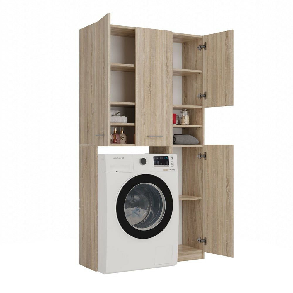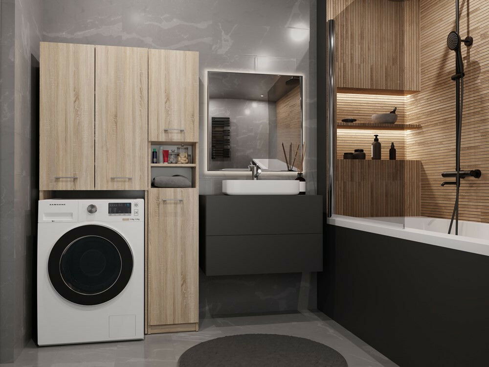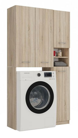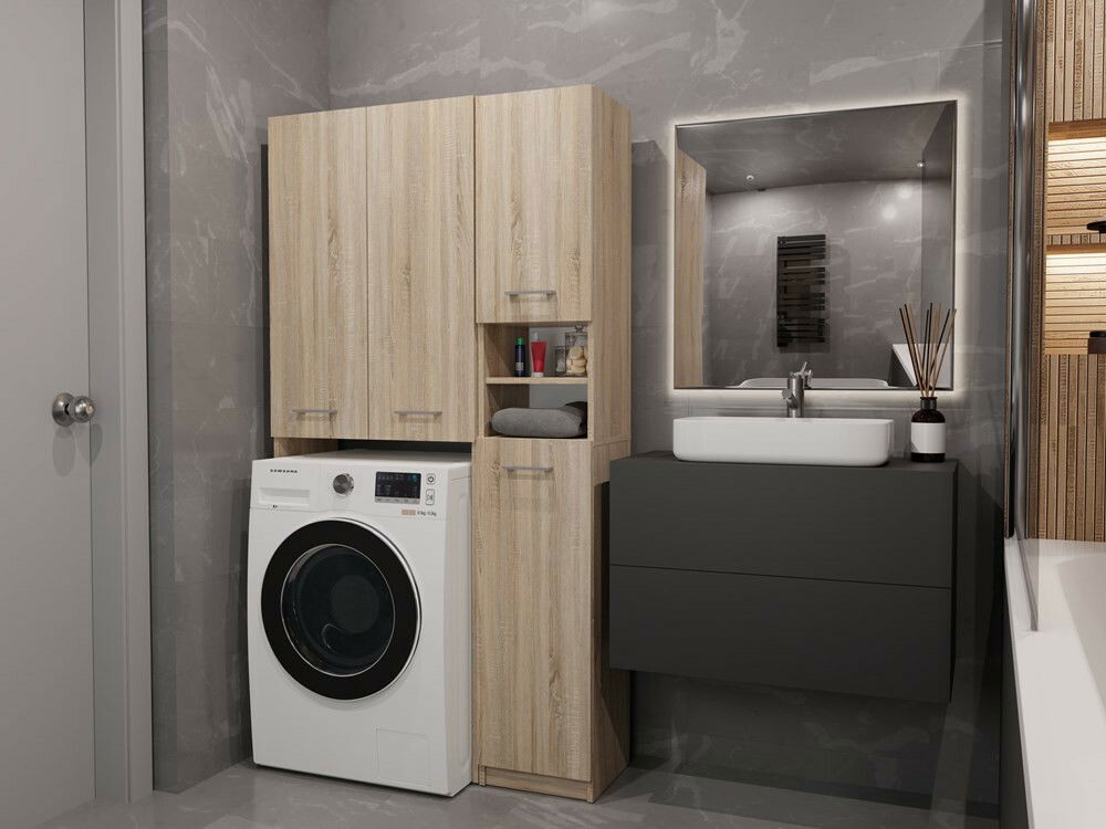 Kúpeľňová zostava Molinos 2 v elegantnej farbe dub sonoma je ideálnym riešením pre každú modernú kúpeľňu. So šikovnou skrinkou nad práčku ponúka dostatok úložného priestoru, pričom nezaberá veľa miesta. Minimalistické úchyty v striebornej farbe zabezpečujú pohodlný prístup k obsahu, zatiaľ čo kvalitné spracovanie z laminovanej drevotriesky a odolné ABS hrany zaručujú dlhú životnosť. Montáž je jednoduchá a prispôsobiteľná, čo z tejto zostavy robí skvelú voľbu pre každého, kto ocení kombináciu funkčnosti a estetiky.