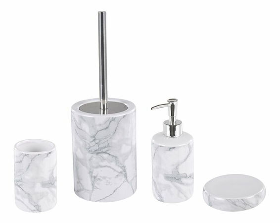 Udržiavanie poriadku v kúpeľni môže byť pomerne náročné, avšak s touto sadou praktických kúpeľňových doplnkov sa tým už viac nemusíte trápiť. Všetky kúsky sú v elegantnej glamour bielej farbe s mramorovou štruktúrou, ktorá bez problémov zapadne do akéhokoľvek typu interiéru. Súprava je štýlovou a praktickou voľbou do každej kúpeľne.