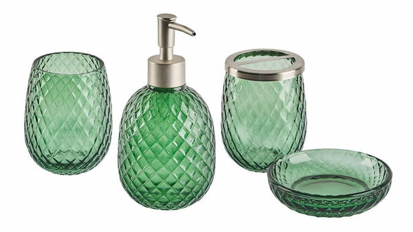Dodajte svojej kúpeľni osobitý nádych pomocou tejto krásnej sady doplnkov. Vďaka nej vylepšíte zariadenie celej miestnosti a zároveň prehľadne zorganizujete všetku svoju kozmetiku. Súprava pozostáva z pohárika, držiaka na zubné kefky, dávkovača s pumpičkou a misky na mydlo, takže všetko potrebné budete mať vždy na dosah ruky. Textúrovaný povrch v kombinácii so zeleným odtieňom robí z tejto súpravy naozaj výrazný kúsok.