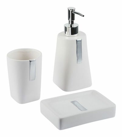 Dodajte svojej kúpeľni štýlový a čistý vzhľad pomocou tejto 3-dielnej sady doplnkov. Súčasťou súpravy je miska na mydlo, dávkovač s pumpičkou a pohár na zubné kefky – teda všetko potrebné na každý deň. Táto štýlová a praktická sada je vyrobená z dolomitu, má minimalistický tvar a zdobí ju jednoduchý strieborný pásik.