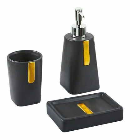 Dodajte vašej kúpeľni štýlový a čistý vzhľad s touto 3 dielnou sadou príslušenstva. Dodáva sa s miskou na mydlo, dávkovačom s pumpičkou a pohárom na vaše zubné kefky. Všetko, čo potrebujete pre rutinné čistenie v jednej sade. Je praktická aj krásna, vyrobená z dolomitu v minimalistickom tvare, zdobená len jediným zlatým prúžkom.