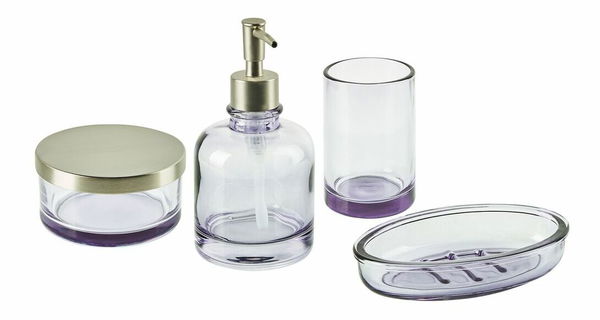 Usporiadajte si kúpeľňové potreby pomocou tejto praktickej súpravy doplnkov. Je vyrobená z číreho skla s jemným fialovým odtieňom a je navrhnutá tak, aby dlho vydržala a ľahko sa čistila. Súprava zahŕňa pohár, misku na mydlo a dávkovač mydla s pumpičkou. K dispozícii je tiež dóza s kovovým vekom ideálna na vatové tampóny, sponky do vlasov alebo iné drobné doplnky.