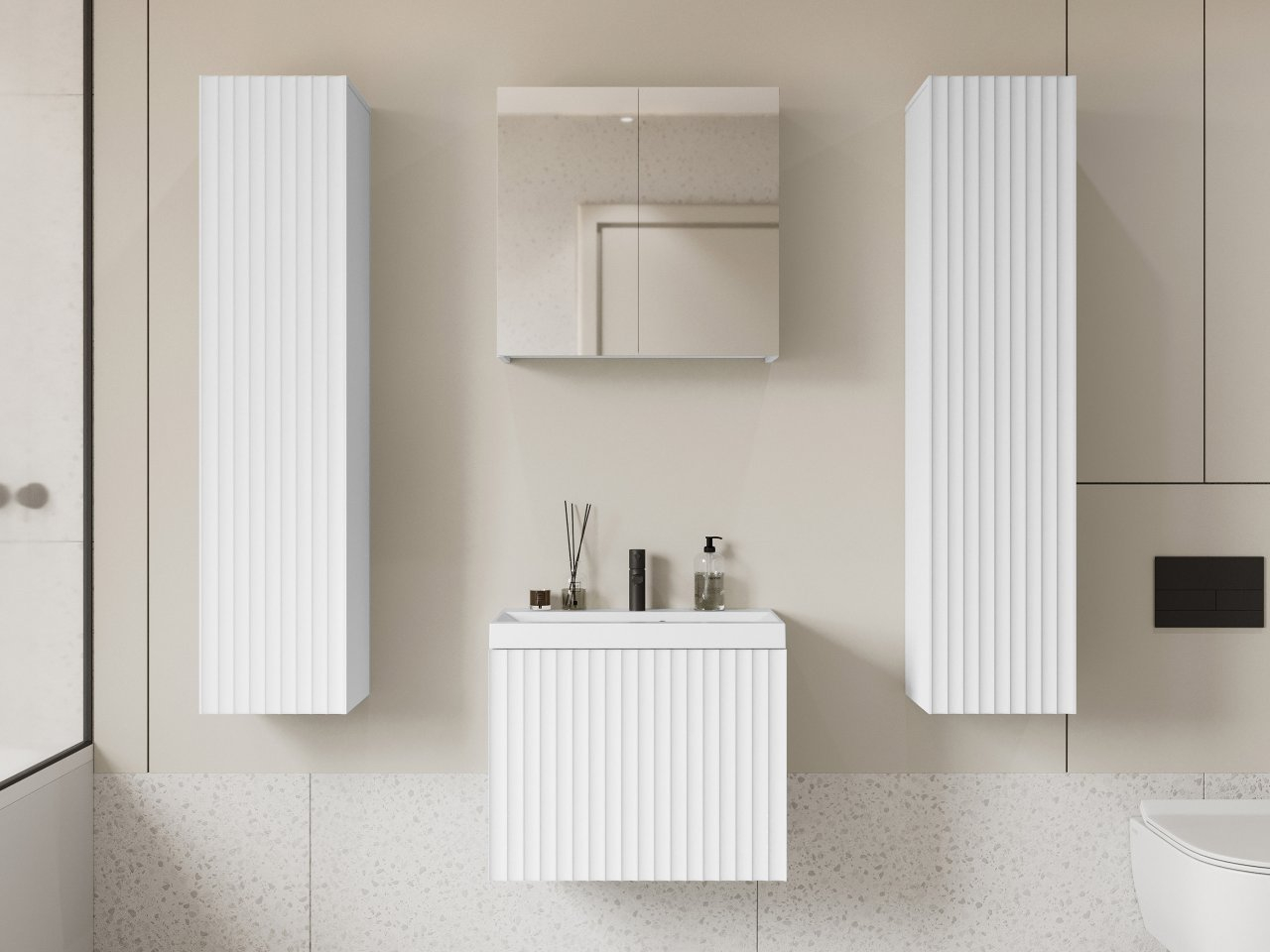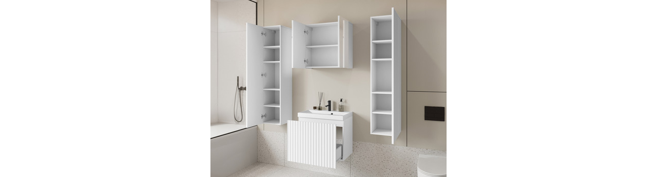 Moderný kúpeľňový nábytok Dymysos II XL vám ponúkne všetko, čo potrebujete na usporiadanie praktického a štýlového priestoru pre každodennú starostlivosť. Nájdete tu dve závesné skrinky, ktoré poskytujú priestor pre kozmetiku alebo čistiace prostriedky. Skrinka s umývadlom je vybavená zásuvkou. Celok dopĺňa závesná skrinka so zrkadlom. Kúpeľňový nábytok sa vyznačuje dekoratívnymi čelami, ktoré dodávajú interiéru štýlový povrch a zdôrazňujú jeho dekoratívny charakter.