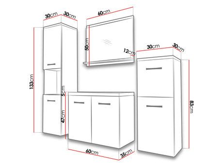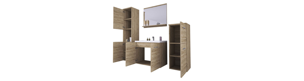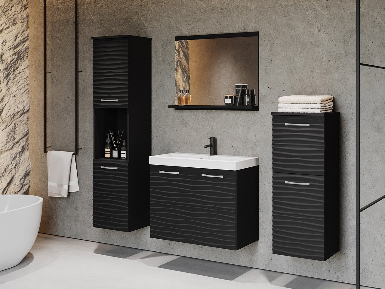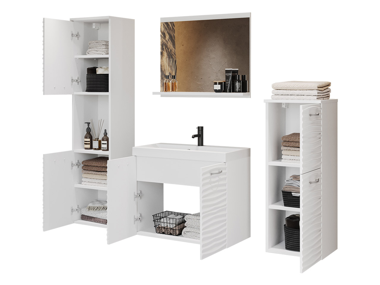 Praktická a predovšetkým dizajnová zostava kúpeľňového nábytku Megasa I MDF sa dobre uplatní v malých aj veľkých kúpeľniach. Kombinácia skriniek s umývadlovou skrinkou poskytuje veľa úložného priestoru. Každá zásuvka ponúka priestranný vnútorný priestor, kde si môžete ľubovoľne usporiadať kozmetiku, ošetrujúce doplnky a čistiace prostriedky. Súčasťou kúpeľňovej zostavy je aj zrkadlo. Táto praktická dekorácia je nenahraditeľným pomocníkom pri starostlivosti o vlasy, vlasovom stylingu a aplikácii make-upu. Ozdobou súpravy je pôsobivá štruktúra čiel.