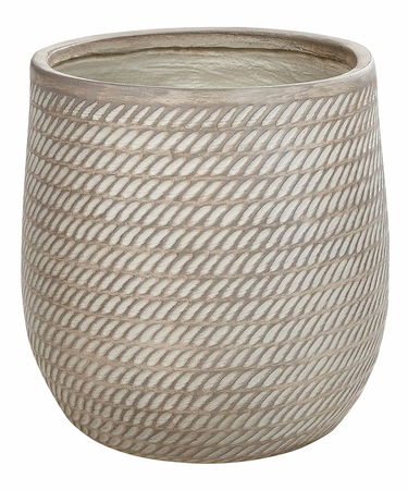 Okrúhly kvetináč, ktorý je kombináciou estetického vzhľadu a funkčnosti. Je vyrobený z odolnej vláknitej hliny a zdobí ho prepracovaný reliéfny vzor, vďaka ktorému vnesie štipku elegancie do každého priestoru. Jemne ošúchaný povrch pôsobí nadčasovo, zatiaľ čo odolná konštrukcia kvetináča zaručuje jeho odolnosť voči meniacim sa teplotám a UV žiareniu. Tento kvetináč s predvŕtaným drenážnym otvorom na dne poskytuje optimálne prostredie pre vaše rastliny, takže je vhodnou voľbou nielen do interiéru, ale aj do exteriéru.