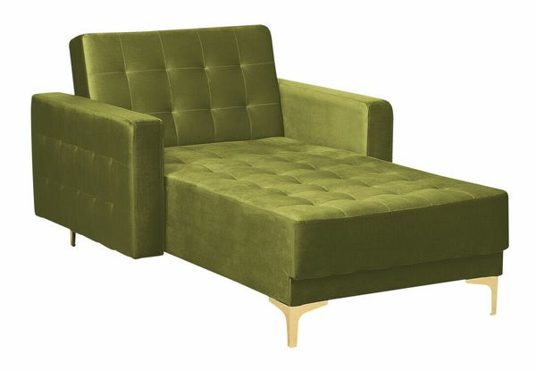 Vďaka nastaviteľnému operadlu vám táto moderná leňoška poslúži aj ako pohodlná denná posteľ. Je čalúnená vysokokvalitnou a štýlovou zelenou zamatovou látkou s elegantným prešívaním a hodí sa do moderného, ale aj tradične zariadeného interiéru. Vďaka modulárnemu dizajnu ju možno kombinovať s iným nábytkom z rovnakej kolekcie a vytvoriť sedaciu zostavu podľa vlastných predstáv. Stabilitu leňošky zaručujú kovové nohy.