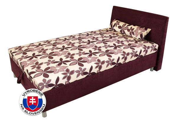 Moderná manželská posteľ Elsona komfort s lamelovým roštom a sendvičovým kokosovým matracom. Posteľ má kovové nožičky. Úložný priestor je prístupný spredu. Posteľ obsahuje vankúš so snímateľnou obliečkou. Farebné prevedenie poťahovej látky je z fialového Mikrostar a Anatara violet.