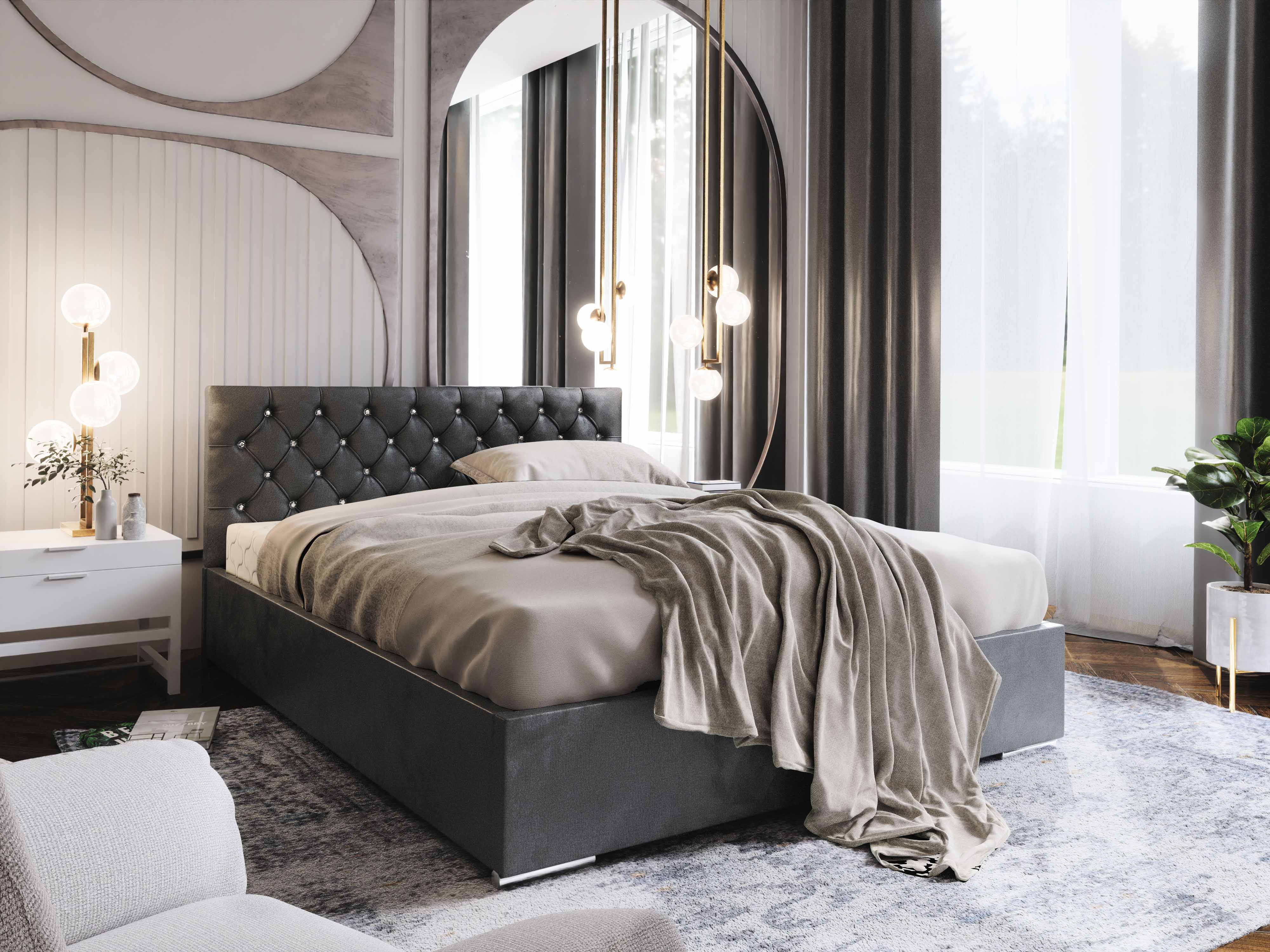 Manželská posteľ 140 cm Kerry (tmavosivá) je moderná posteľ s dekorom v tkanine na vysokom čele postele. Vnútri postele sa nachádza rošt aj úložný priestor na posteľnú bielizeň. Posteľ je k dispozícii v niekoľkých farebných aj rozmerových variantoch. Konštrukcia je vyrobená z kombinácie drevotriesky a dreva. Výška čela postele je 115 cm, výška bočníc 35 cm, dĺžka 210 cm a maximálne zaťaženie 240 kg. Posteľ je vybavená úložným priestorom na posteľnú bielizeň s mechanizmom, ktorý uľahčuje otváranie. Matrac nie je súčasťou produktu, ale je možné ho zakúpiť v našom internetovom obchode. Vhodný matrac má výšku 10 cm a pružinu bonell.