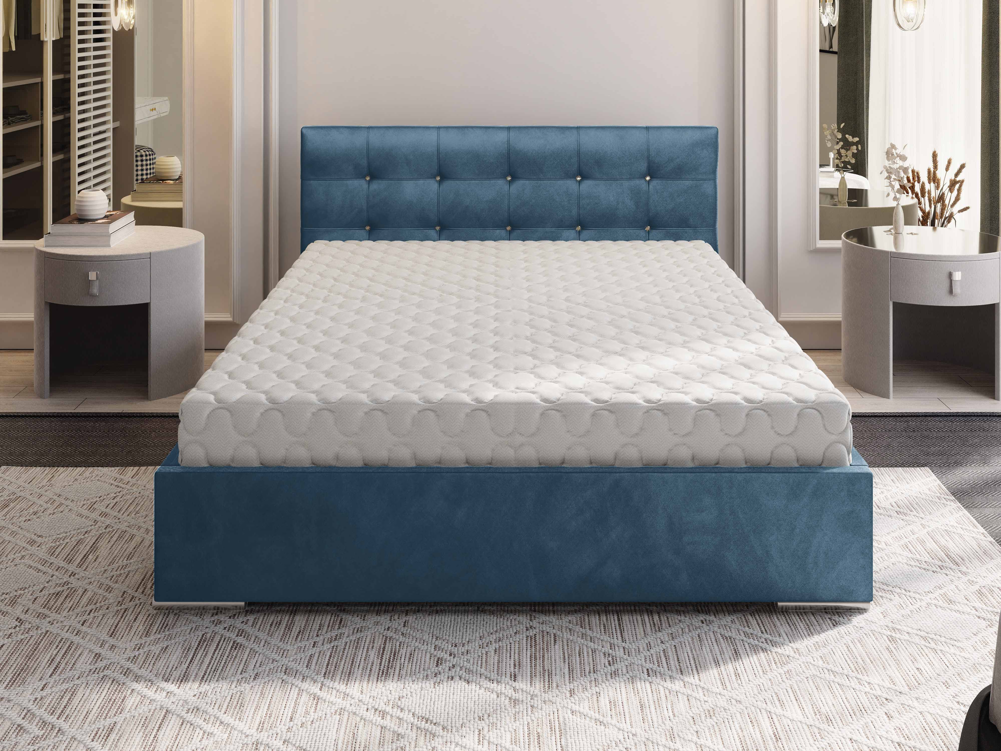 Manželská posteľ Lonnie 140 cm s modrým plastickým čelom a zapošitými gombíkmi je vyrobená z kombinácie drevotriesky a dreva. Posteľ obsahuje rošt aj úložný priestor na posteľnú bielizeň. Dostupná je v rôznych farebných a rozmerových variantoch. Tkanina Monolith 72 je testovaná na odolnosť voči oderu. Posteľ má výšku čela 115 cm a dĺžku 210 cm. Maximálna nosnosť je 240 kg. Matrac nie je súčasťou produktu, ale je možné si ho priobjednať. Úložný priestor je vybavený mechanizmom na otváranie.