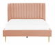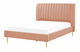 Elegantná posteľ v modernom štýle s vysokým a hrubo vystužený operadlom. Klasický obdĺžnikový tvar postele dopĺňa prešívané čelo, ktoré posteli dodáva moderný vzhľad. Nohy sú perfektne vyvážené a neodvádzajú pozornosť od elegantného dizajnu, ale zaisťujú silnú, pevnú a odolnú konštrukciu. Celá posteľ je čalúnená zamatom v broskyňovom odtieni ružovej, ktorý jej dodáva sofistikovaný vzhľad.