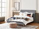 Elegantná posteľ v modernom štýle s vysokým a hrubo vystužený operadlom. Klasický obdĺžnikový tvar postele dopĺňa prešívané čelo, ktoré posteli dodáva moderný vzhľad. Nohy sú perfektne vyvážené a neodvádzajú pozornosť od elegantného dizajnu, ale zaisťujú silnú, pevnú a odolnú konštrukciu. Celá posteľ je čalúnená sivým zamatom, ktorý jej dodáva sofistikovaný vzhľad.