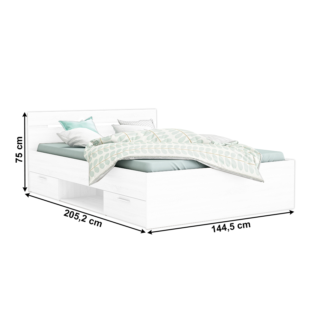 Manželská posteľ Myriam je elegantná posteľ s plochou na spanie 140x200 cm a výškou 75 cm. Posteľ je vyrobená z pevného a odolného materiálu DTD laminovaná v elegantnom prevedení biela. Disponuje dvoma šuplíkmi a otvoreným odkladacím priestorom, ktoré sa nachádzajú pod posteľou. Šuplíky si viete namontovať z pravej alebo ľavej strany. Materiál a farba posteľe umožní zapadnúť do všetkých interiérov a vytvoriť štýlové a útulné prostredie pre dobrý spánok.