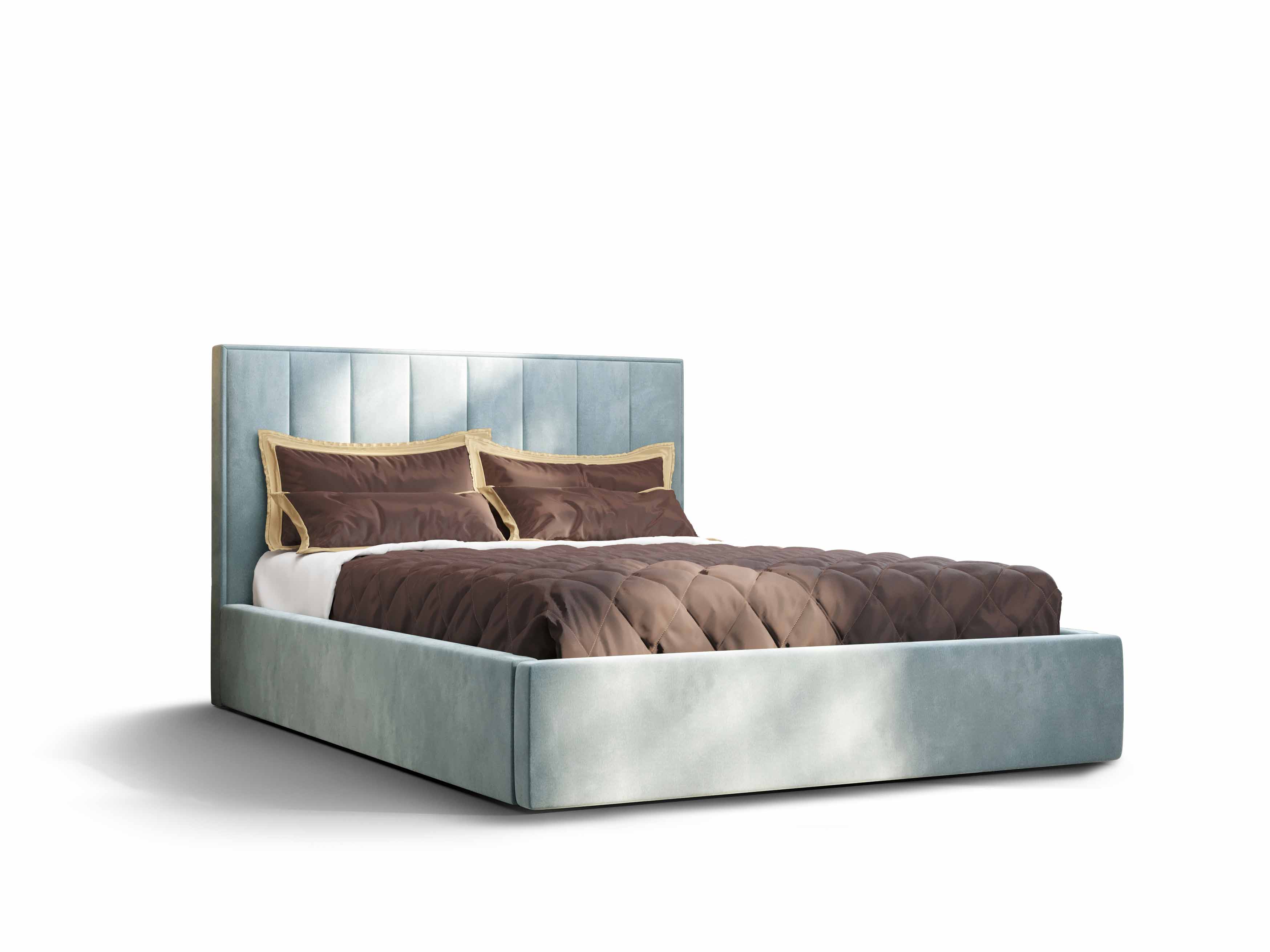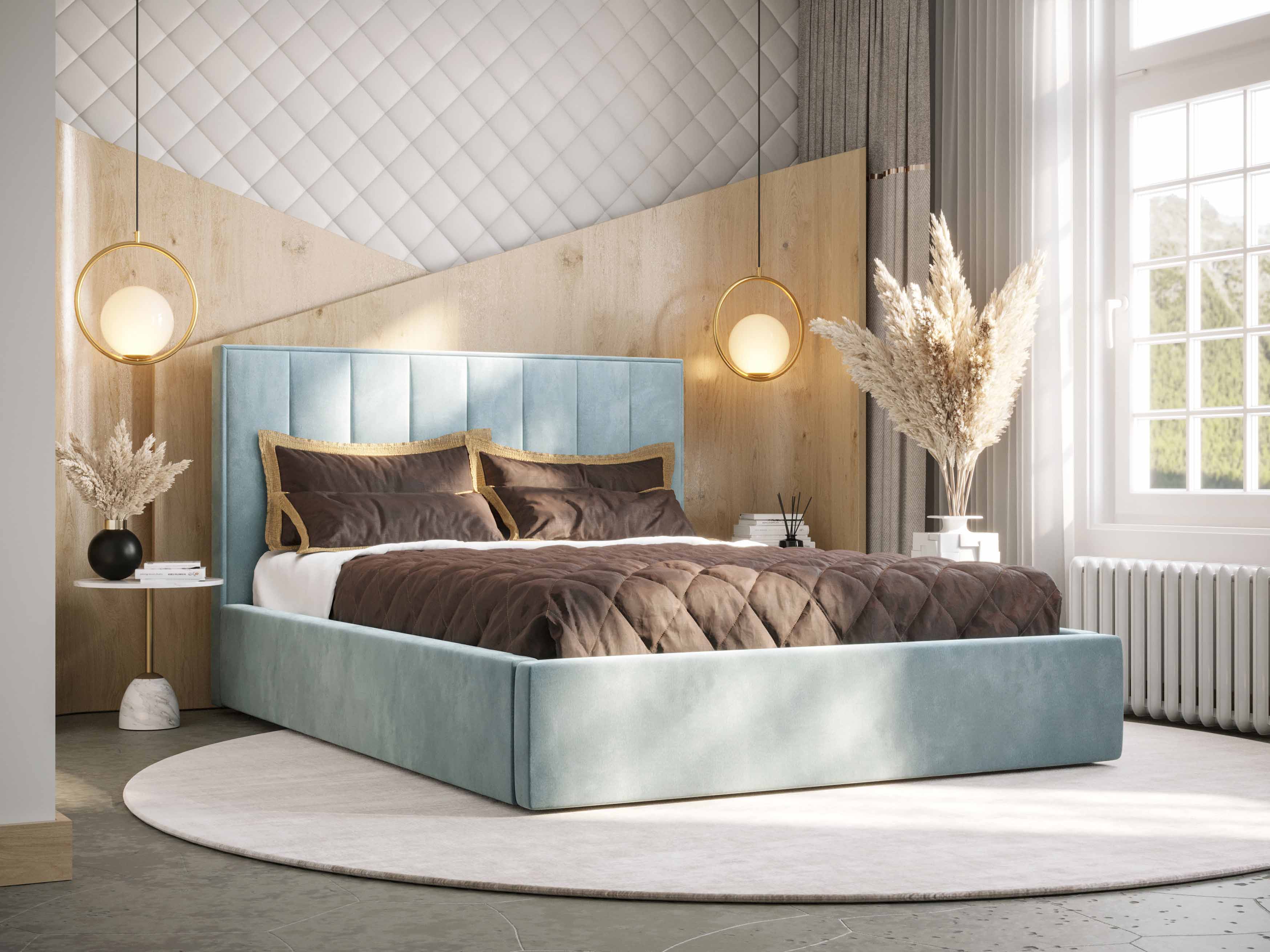 Manželská posteľ s čelom v modrej farbe zo série Ocie je vybavená roštom a úložným priestorom. Ide o posteľ s výškou čela 115 cm, dĺžkou 210 cm a šírkou 140 cm. Konštrukcia je z dreva a drevotriesky, až do 240 kg záťaže. Posteľ ponúkame v niekoľkých farebných a rozmerových variantoch. Tkanina použitá na čele postele je Monolith 72, ktorá má vysokú odolnosť proti oderu. Matrac nie je súčasťou produktu, no môžete si ho objednať z nášho internetového obchodu. Vhodným matracom sú ten s výškou 10 cm a pružinou bonell. Posteľ je tiež vybavená úložným priestorom na posteľnú bielizeň s mechanizmom uľahčujúcim otváranie.