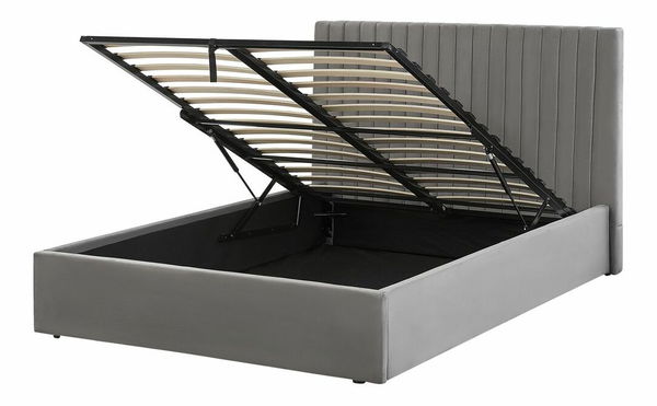 Skrášlite si spálňu touto čalúnenou posteľou a doprajte si pokojný spánok. Posteľ je čalúnená kvalitným zamatom, ktorý je príjemný na dotyk, nevyžaduje si každodennú údržbu a sivej farbe dodáva nádherný lesk. Vysoké prešívané čelo zvýrazňuje dizajn postele a ponúka extra pohodlie. Posteľ je vybavená úložným priestorom ukrytým pod dreveným roštom, do ktorého budete môcť odložiť náhradné vankúše, obliečky alebo pyžamo.